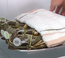 2.用蟹草将蟹钳、蟹脚扎牢.